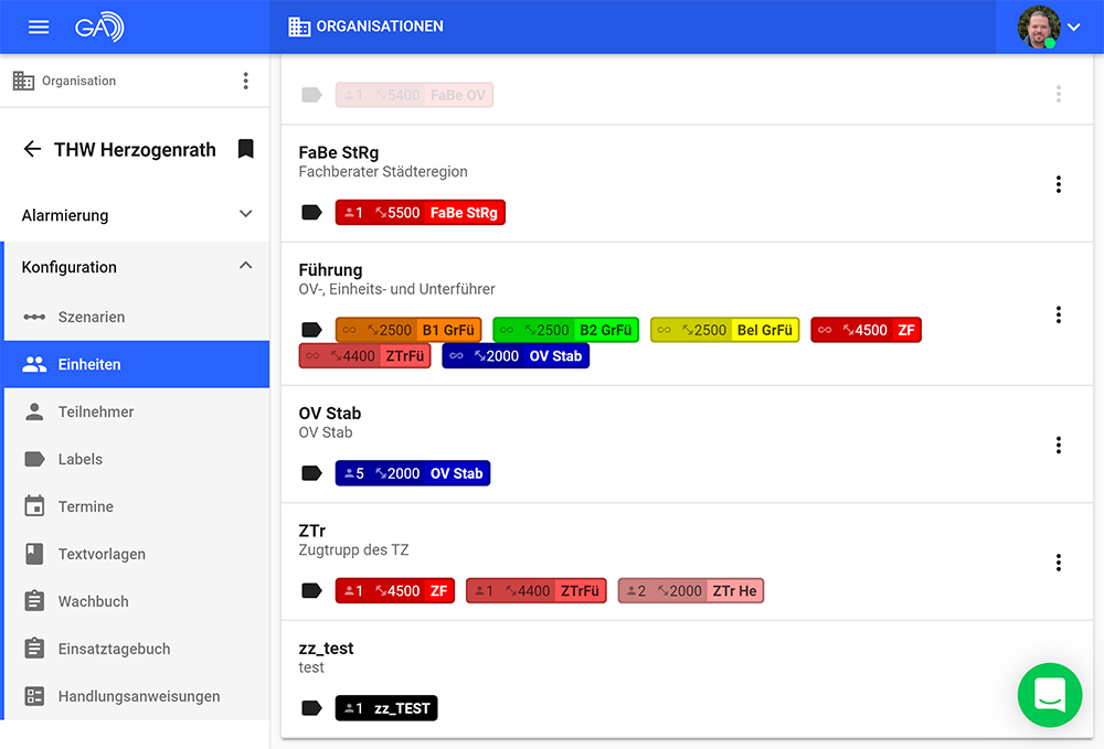 In den Einheiten stellen wir aus den Labels die Positionen zusammen. Für eine volle Einheit müssen diese Positionen den Teilnehmern zugeordnet und besetzt sein. Hier - wie zuvor angelegt -Gruppenführer, Truppführer und Helfer. Und da ohne ihn nichts läuft, haben wir den Kraftfahrer gesondert angelegt. Die Gesamtanzahl der Personen richtet sich hier nach Sitzplätzen im Auto.