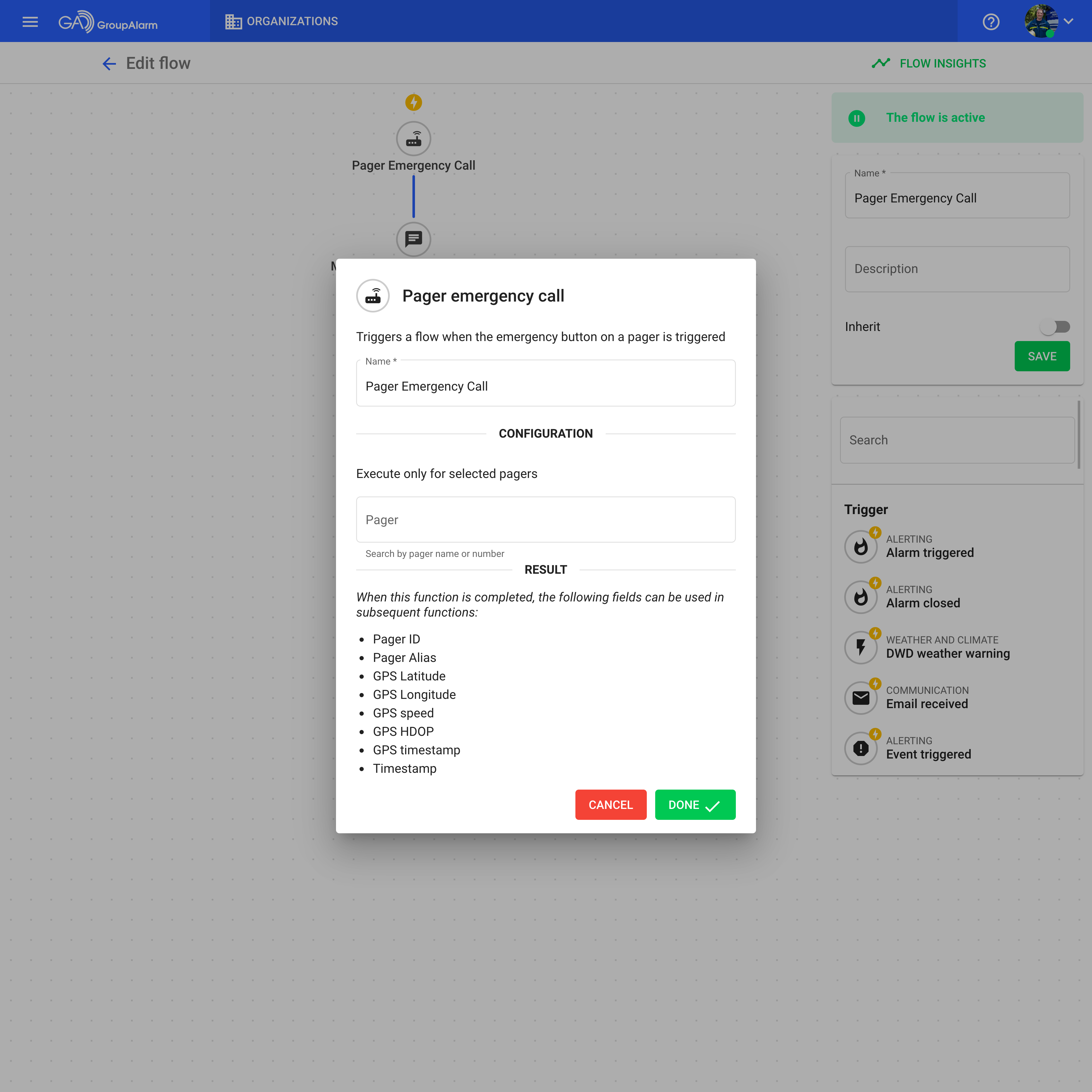 Two triggers have been added to the flow, which respond to the dead man’s switch and the emergency call button of the FRED pager. Both functions can be activated and configured on the pager. In the case of lone worker protection, an alarm is triggered if a regular deadman tone is not acknowledged. The emergency call function is triggered at will by pressing a button. With both variants - if enabled - the GPS location of the device as well as all other device data are transmitted. In GroupAlarm these are available in the flow incl. the assigned pager user for further processing, e.g. to trigger an alarm or to create a messenger message.