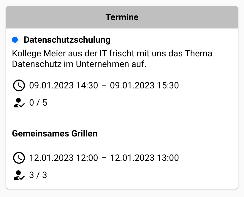 Die Terminliste im Monitor hat neue Funktionen erhalten und wurde optisch überarbeitet.Sie können nun optional die Beschreibung des Termins und die Anzahl positiver Rückmeldungen einblenden. Zudem lässt sich die Endzeit nun auch ausblenden.