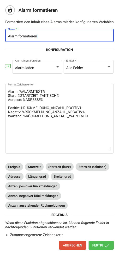 Mit der neuen Funktion Alarm formatieren können Sie Alarmdetails als einfache Zeichenkette für weitere Funktionen des Flows zur Verfügung stellen. So können Sie zum Beispiel die Startzeit in mehreren Formaten, den Alarmtext und auch die Anzahl der jeweiligen Rückmeldungen – positiv, negativ und ausstehend – ausgeben.