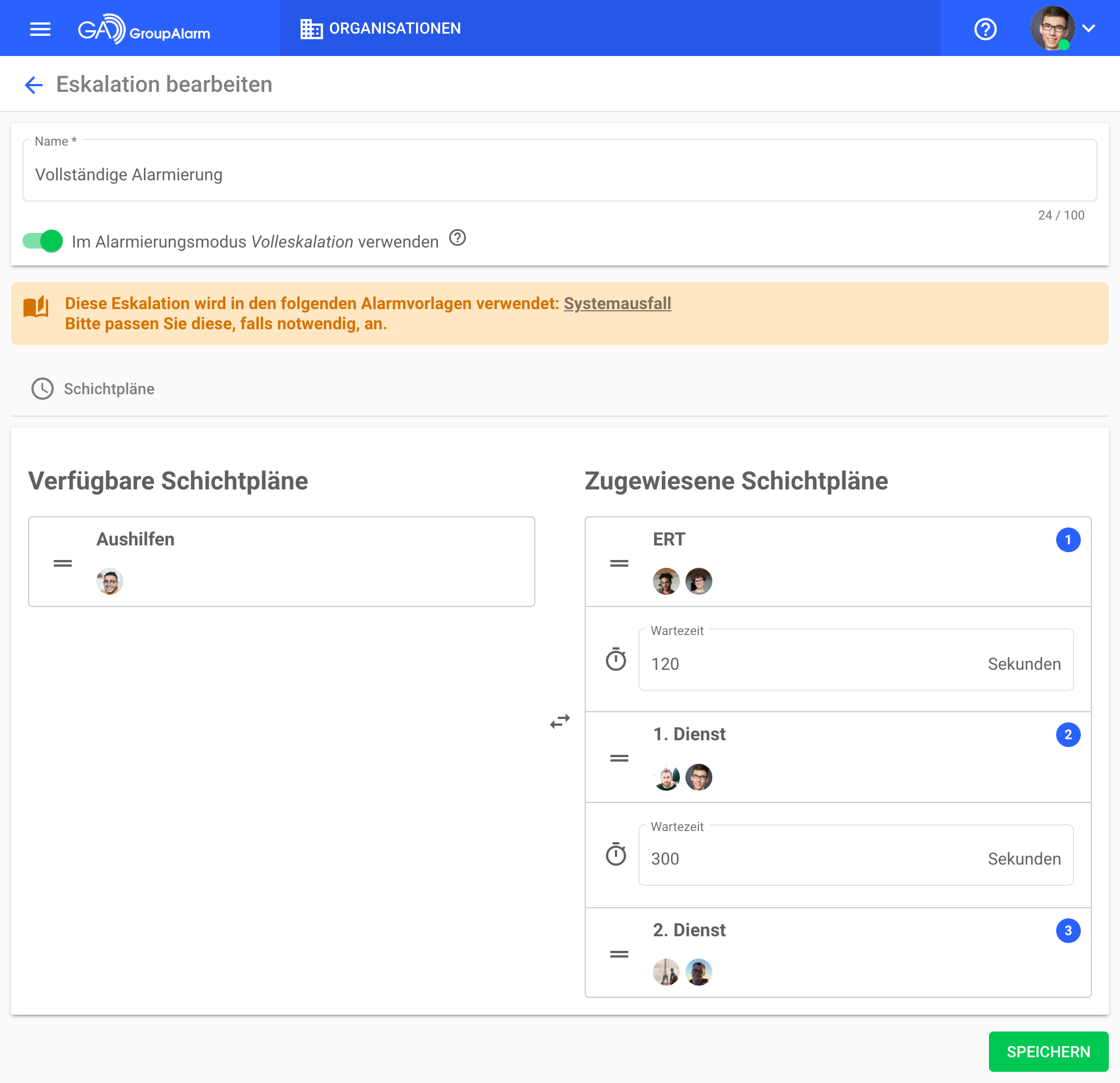 Ähnlich zum bekannten Eskalationsmodus werden zuvor Schichtpläne mit den gewünschten Teilnehmern in der passenden Reihenfolge und mit festgelegten Wartezeiten angelegt. Bei der Alarmauslösung können Sie dann die Volleskalation mit dem jeweiligen Eskalationsmodell und der Einstiegsstufe auswählen.