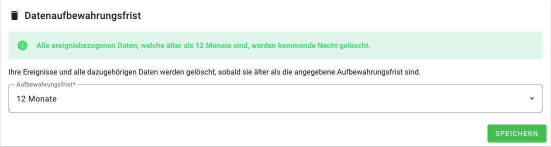 Alte Ereignisse und Alarme können nun komplett aus GroupAlarm entfernt werden. Setzen Sie dazu die Zeitspanne in den Einstellungen der Organisation auf 1 / 3 / 6 / 12 / 18 / 24 Monate. Die Einstellung wirkt sich auf alle Ereignisse und alle dazugehörigen Daten aus, also Alarme inkl. Rückmeldungen, PDF-Reports, Einsatztagebücher und Messenger-Räume. Die Löschung wird im Audit-Log dokumentiert.
