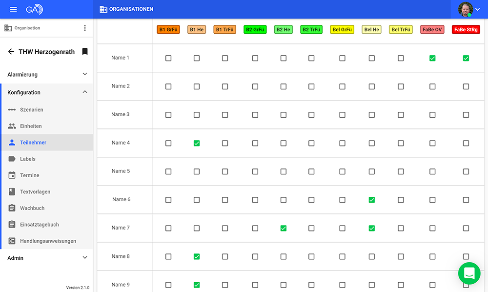 Sobald sich die Teilnehmer angemeldet und ihre Kontaktmöglichkeiten hinterlegt haben, kann man den einzelnen Personen zuvor erstellte Labels im Reiter „Zuordnung“ zuweisen. Hier wird natürlich als erstes die STAN-Position zugeordnet. Aber wie es fast überall üblich ist, bekleidet eine Person oftmals mehrere Positionen oder Sonderaufgaben. Die relevanten kann man hier zuordnen (siehe KF, FaBe etc.).