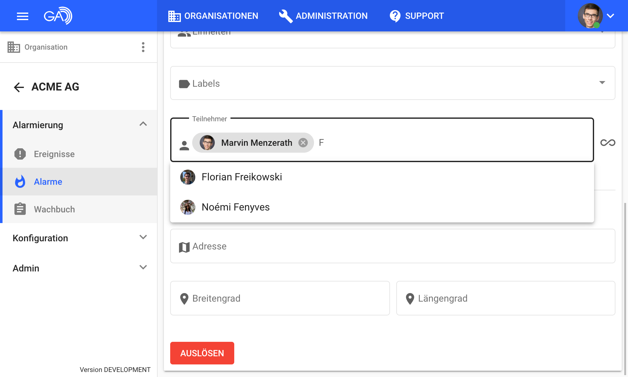 Die Teilnehmerauswahl beim Anlegen eines Alarms wurde überarbeitet, sodass Ihnen nun statt einer Auswahlliste ein Suchfeld zur Verfügung steht. Ausgewählte Teilnehmer werden anschließend im Eingabefeld mit Ihrem Avatar angezeigt.