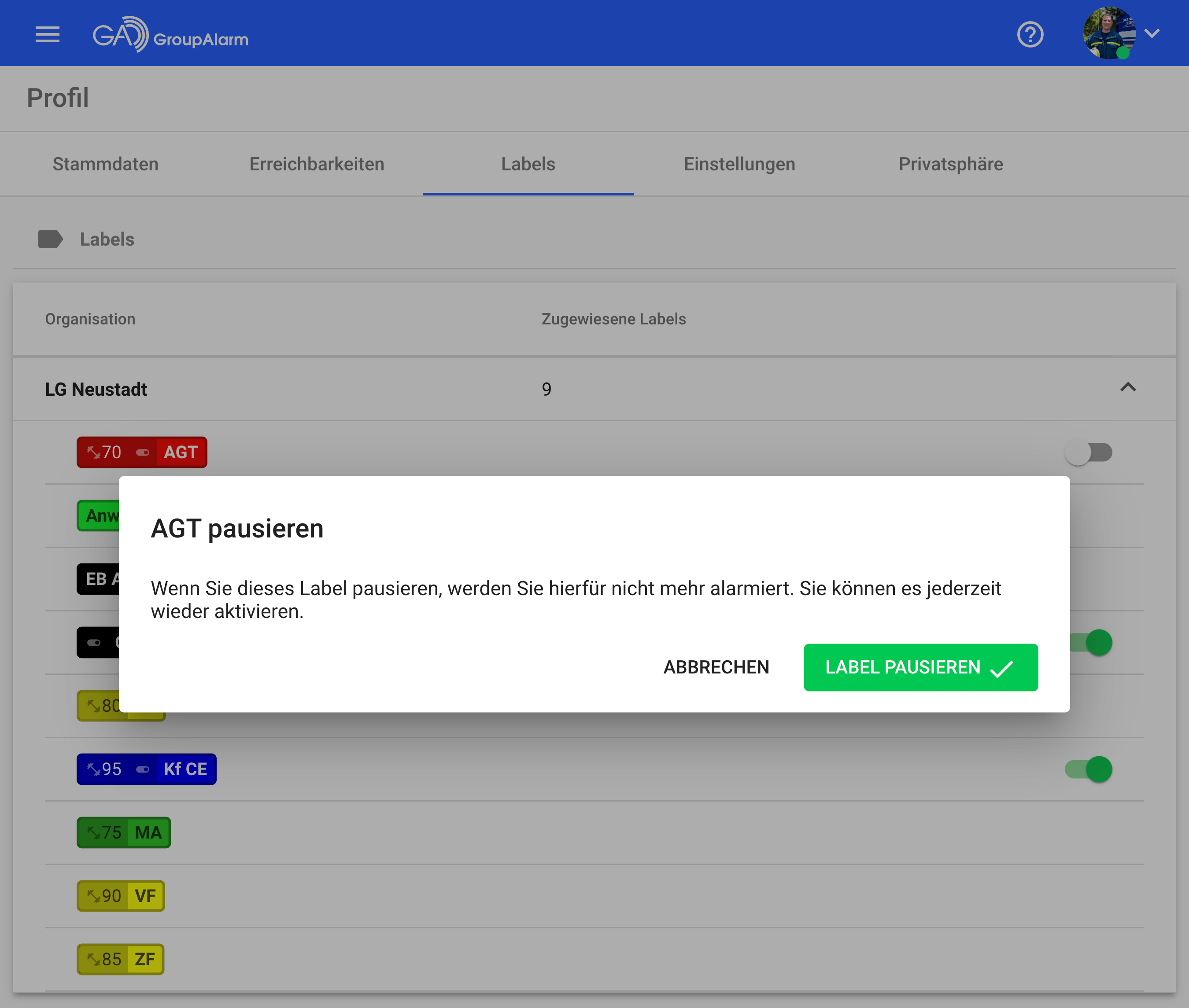 Eine neue Option in den Einstellungen der Labels erlaubt es, einmal zugewiesene Labels durch Teilnehmer selbst verwalten zu lassen. Die dazu notwendigen Funktionen finden Administratoren in den Einstellungen der Labels. Entsprechend konfigurierte Labels erhalten in der Profilansicht des Teilnehmers die Möglichkeit, das Label zu pausieren. Ein pausiertes Label erhält keine Alarmierungen mehr.