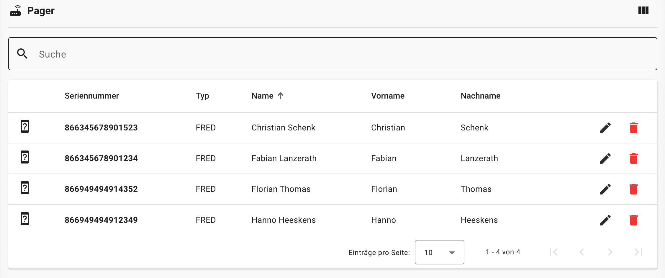 Die Tabelle in der Pagerverwaltung erlaubt nun die Suche nach Pagernummer, Name und Teilnehmer sowie die Sortierung nach diesen Kriterien und dem Pagerstatus.