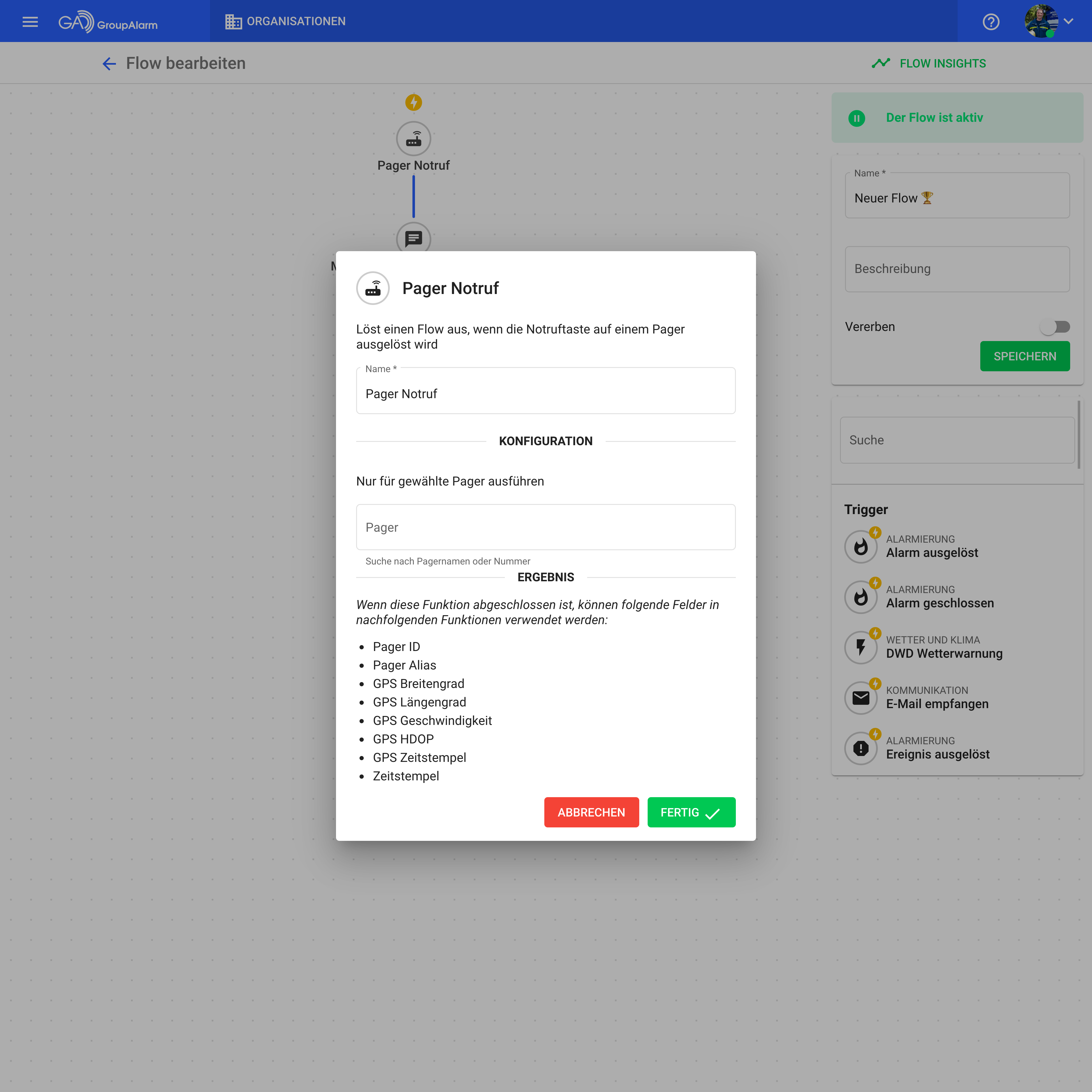 Bei beiden Varianten werden - wenn freigegeben - der GPS-Standort des Gerätes so wie alle weiteren Gerätedaten übermittelt. In GroupAlarm stehen diese im Flow inkl. des zugeordneten Pagernutzers zur weiteren Verarbeitung bereit, um z.B. einen Alarm auszulösen oder eine Messenger-Nachricht zu erstellen.