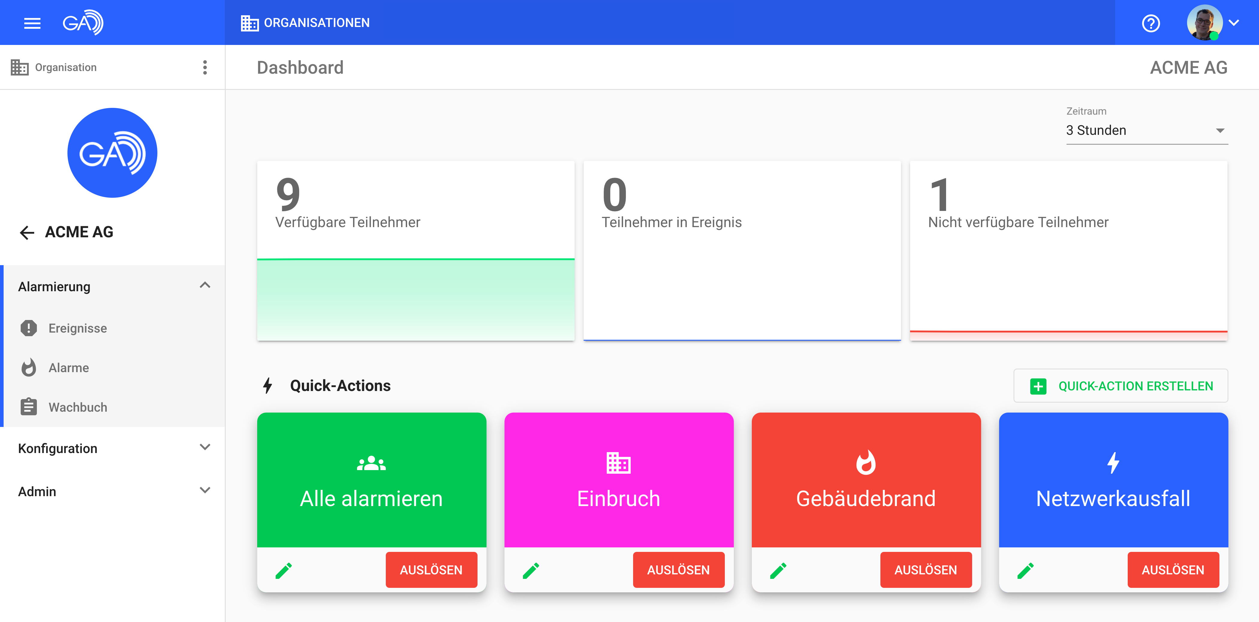 Mit der Einführung der Alarmvorlagen haben wir die Auslösung von Alarmen für vorgefertigte Alarme deutlich vereinfacht. Im nächsten Schritt machen wir es für berechtigte Teilnehmer noch einfacher, Tags und Alarmvorlagen direkt über das Dashboard Ihrer Organisation vorzubereiten und auszulösen. Dazu können in Zukunft Quick-Actions einer Organisation verwendet werden.