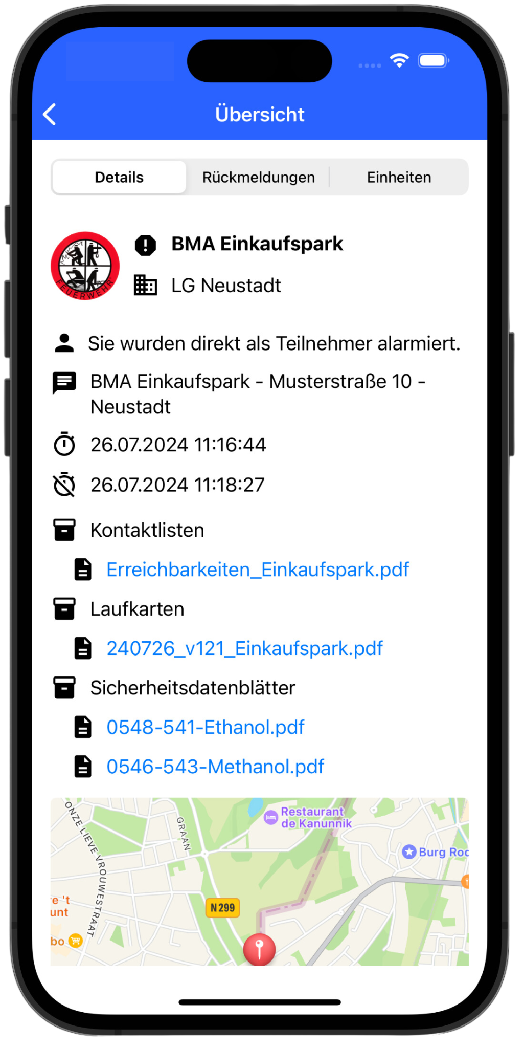 With the document manager, firefighters have immediate access to all relevant information via the app as soon as the alarm is raised. Property plans, route maps and water extraction points provide clear orientation, while rescue maps and hazardous substance data sheets provide vital details. This provides emergency services with important information for dealing with the situation even before they arrive at the scene.