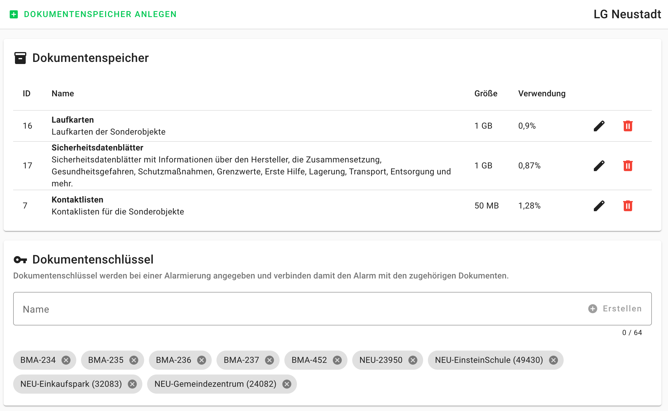 Within an existing GroupAlarm account, any number of document storage locations can be booked, each with up to 10 gigabytes of space. This allows, for example, property plans, telephone lists, forms, evacuation plans, hydrant plans and rescue maps to be stored centrally and easily retrieved when required.