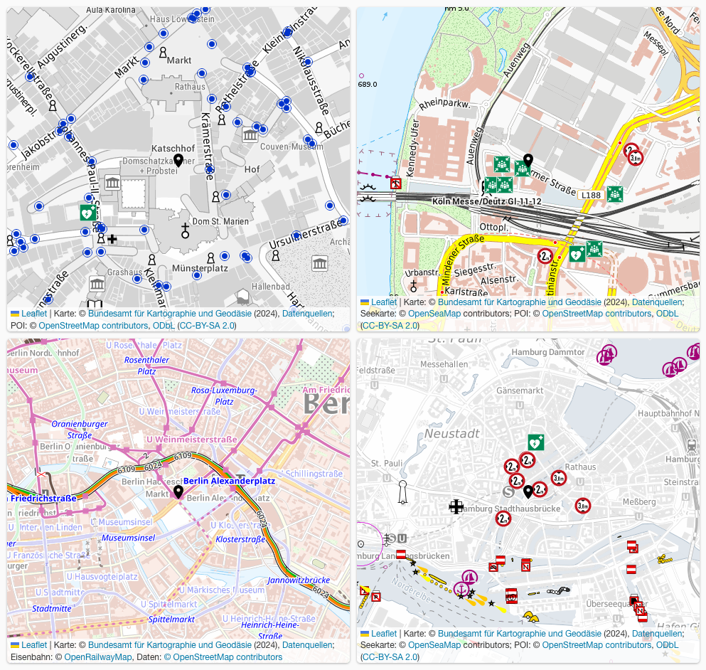 The points of interest are each displayed in a 500-meter radius around the event location or the predefined address and are therefore available in the dynamic and static map.