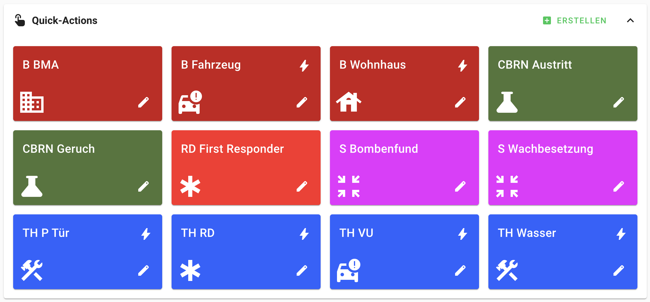 Prepared alarm templates or tags can be conveniently triggered via the quick actions from the dashboard or the Quick Actions app. All fields are pre-filled and the alarm can be triggered with a single click. The layout of the quick actions has been updated to provide a better overview. In addition, the entire area can be hidden if the quick actions are only used via the app, for example. The setting is saved per organisation for the user.
