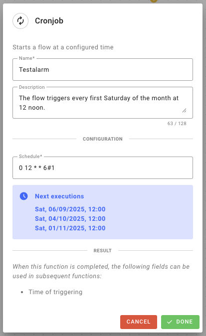 The new flow trigger cronjob enables the automation of recurring manual tasks. Up to five cronjobs can be set up per organization to automate processes that run at fixed time intervals.